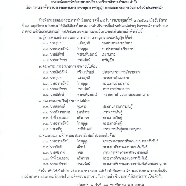 เรื่อง การเลือกตั้งรองประธานกรรมการ เลขานุการ เหรัญญิก และคณะกรรมการอื่นตามข้อบังคับสหกรณ์ฯ