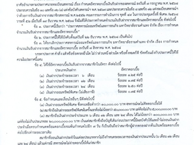 เรื่อง การกำหนดจำนวนเงินรับฝากจากสมาชิกและอัตราดอกเบี้ย