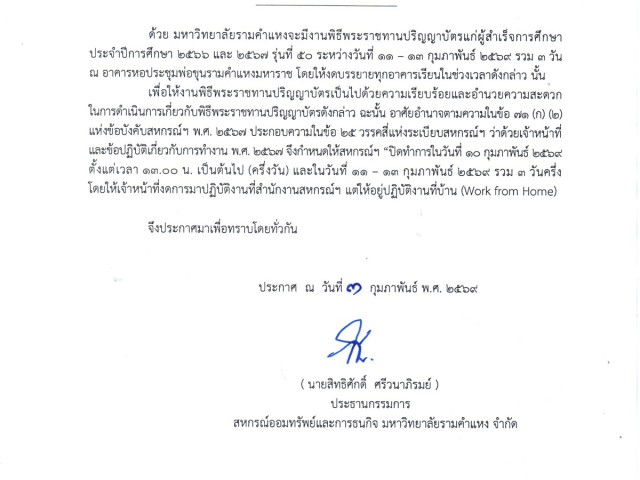 เรื่อง ปิดทำการและให้เจ้าหน้าที่ปฎิบัติงานนอกสถานที่